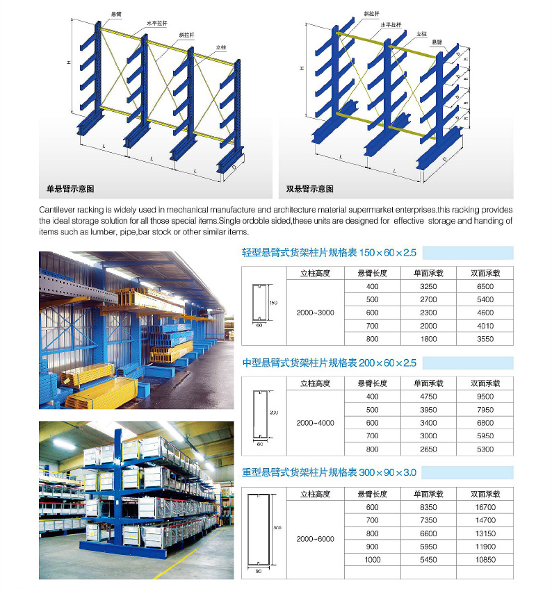 懸臂是屬于倉儲貨架類別中的一類,采用專用型材立柱,配高強度懸臂,適用于存放各種長形物料、環(huán)型物料、板材和不規(guī)則物料等。其前伸的懸臂可以是單面或雙面,具有結構輕、載重能力好的特點,單臂承重可達1000kg.特別加固的立柱結構,可以承受2000~3000kg壓力。設計背拉增加貨架整體穩(wěn)定性,安裝簡易,配件齊全。組合式結構,專用型材立柱,設計背拉增加穩(wěn)定性,配高強度懸臂(臂可以為單面或雙面),具結構輕巧、載重能力好、空間利用率高;加了擱板后,特別適合空間小,高度低的庫房,管理方便,視野寬闊,與普通擱板式貨架相比,利用率更高;根據(jù)承載能力可分為輕量型、中量型、重量型三種。
