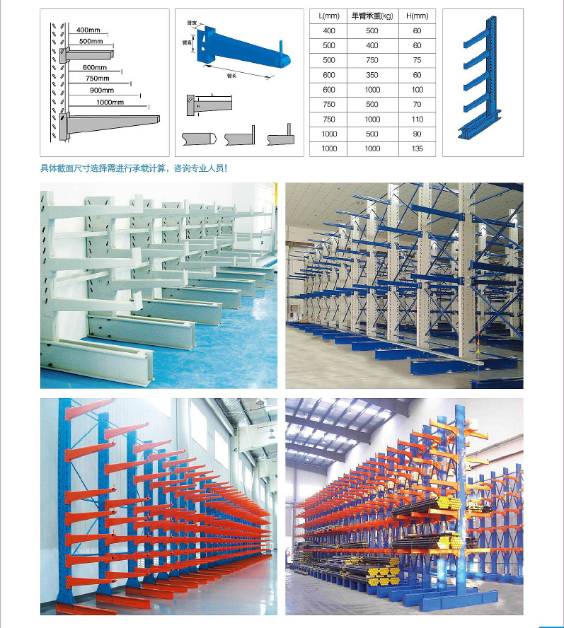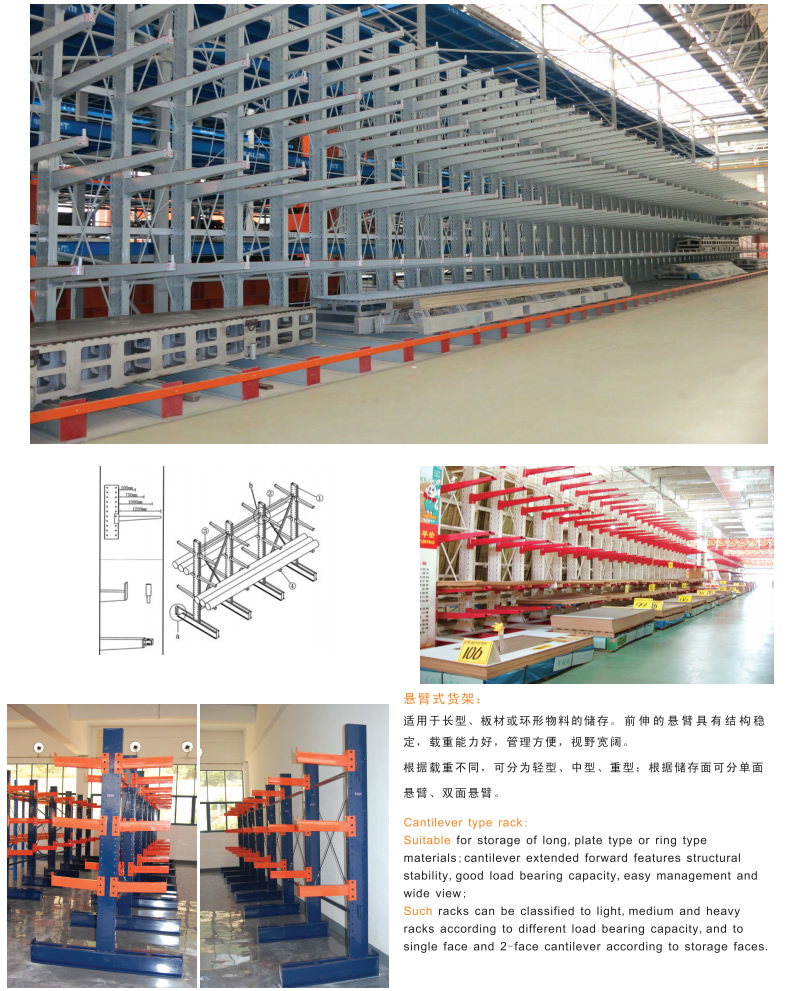1、懸臂貨架系列全部采用組合式,拆裝,運輸,調(diào)節(jié),移動等簡易方便,安全可靠