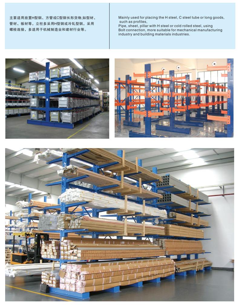 懸臂式貨架多用于機械制造行業(yè)和建材超市等。加了擱板后,特別適合空間小,高度低的庫房,管理方便,視野寬闊,利用率比普通貨架更高。懸臂式貨架是在傳統(tǒng)式貨架支柱上裝設外懸臂而成,是一種長形物專用的貨架。